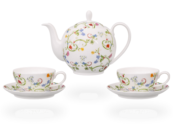 Teeservice mit elegantem Blumendesign. Teekanne mit 1 Liter, Teetassen mit je 150ml Füllvolumen.